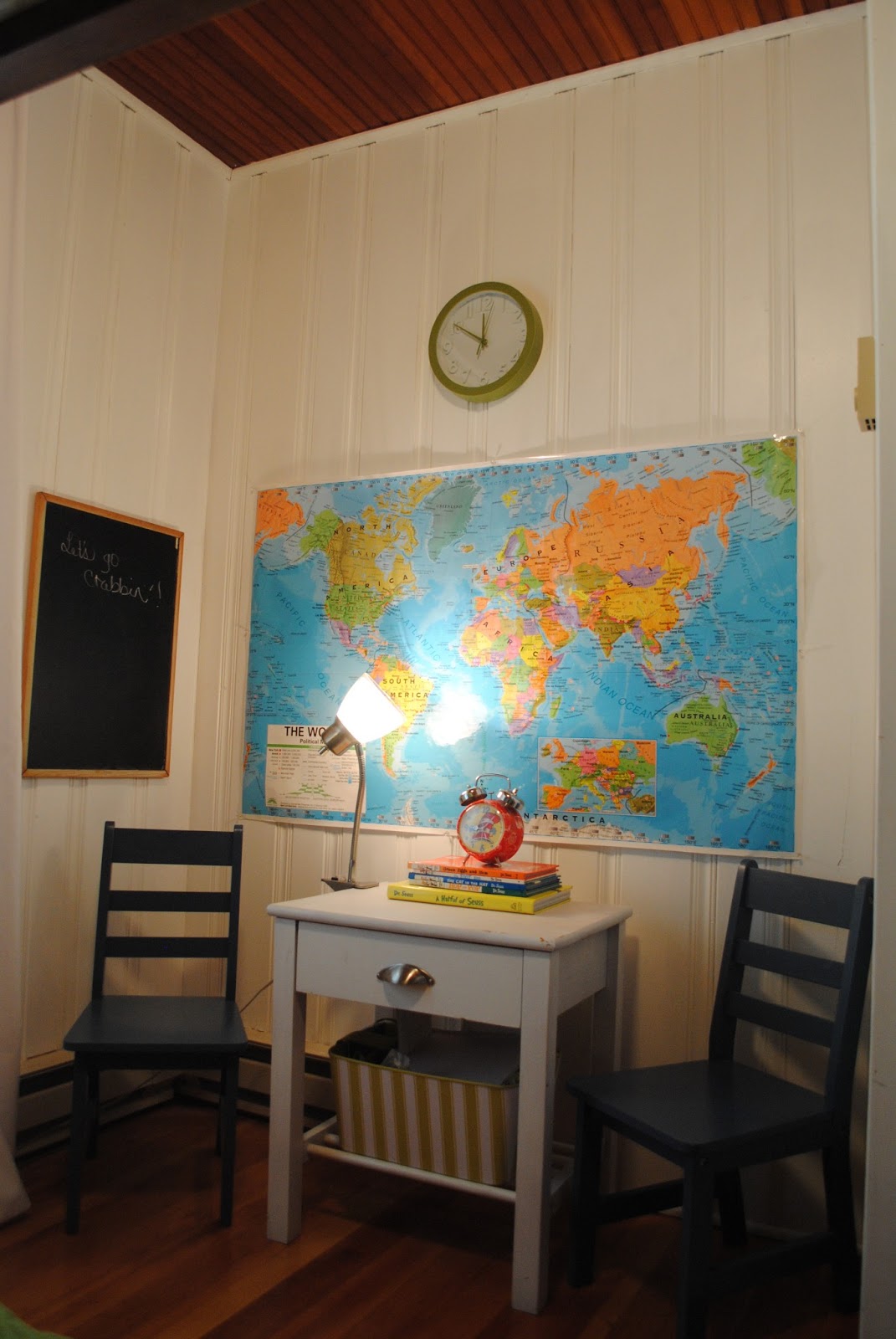 A friends' night stand painted white and given a shiny new piece of hardware makes a super cute table for the kids to sit and play at.
